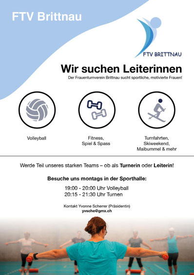 Der Frauenturnverein Brittnau sucht sportliche, motivierte Frauen, die Lust haben, sich aktiv zu engagieren - sei es als Turnerin oder als Leiterin. Ob Volleyball, Fitness, Spiel & Spass oder gemeinsame Ausflüge wie Turnfahrten, Skiweekends und Maibummel, bei uns steht die Freude an Bewegung und Gemeinschaft im Mittelpunkt.